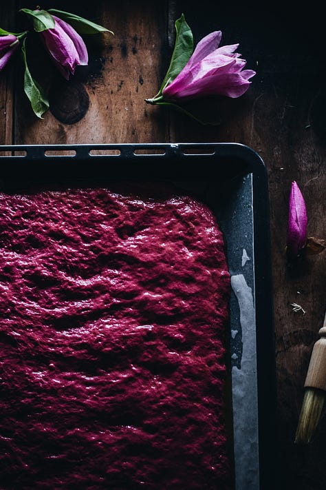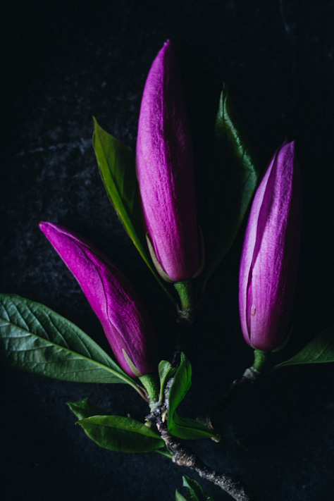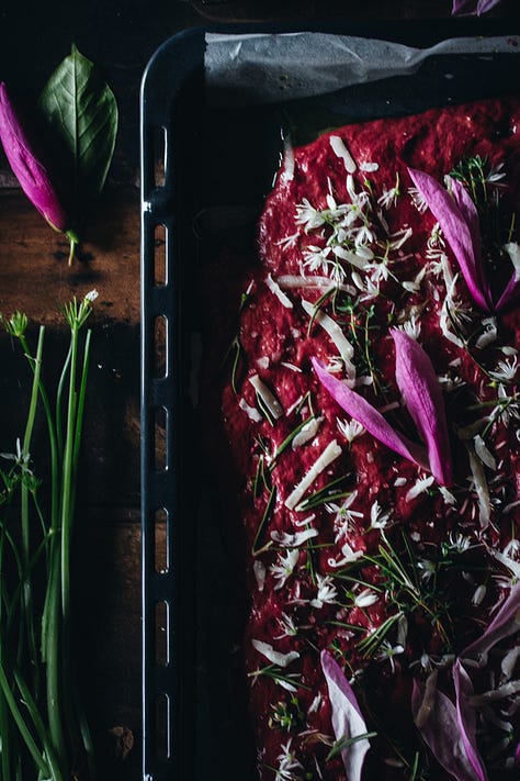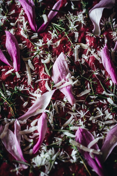 Magnolia blooms and petals can be used in a variety of ways. The simplest is to include them fresh on top of salads, soups, and sauteed vegetables. They pair wonderfully with bitters, radicchio, goat cheese, ricotta, red onion, pickled radishes, cardamom, strawberries, and oranges. Chopped fresh petals can be added to cake batter, muffins, or hot chocolate. They work great in savory dishes too: use them in omelets, in a dumpling mix, or in spring rolls. Use fresh magnolia petals for decorating a spring beetroot focaccia together with thyme, rosemary, and wild garlic flowers.