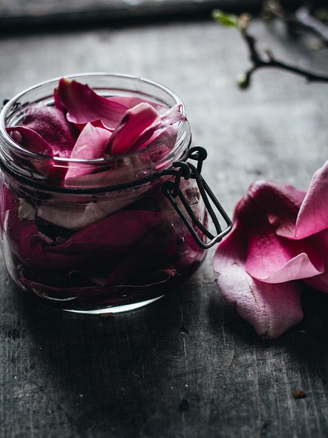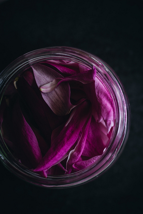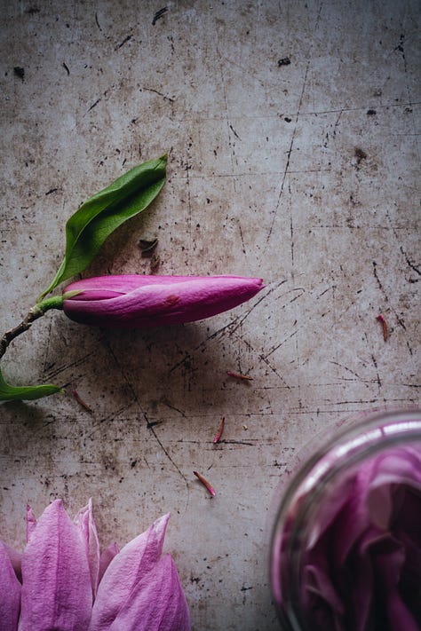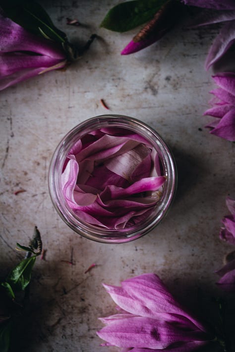 Magnolia petals are great added to kimchi, or included in different ferments, especially pickled radishes, daikon, red onion, and mushrooms. I love to pickle magnolia blossoms and buds in light white wine or rice vinegar, adding sugar, a bit of salt, and pickle spices. Cardamom, dried hibiscus, rosehip, and dried rose petals pair very nicely with them too. This year I pickled magnolia petals with my homemade kombucha and the pickle tastes wonderful!