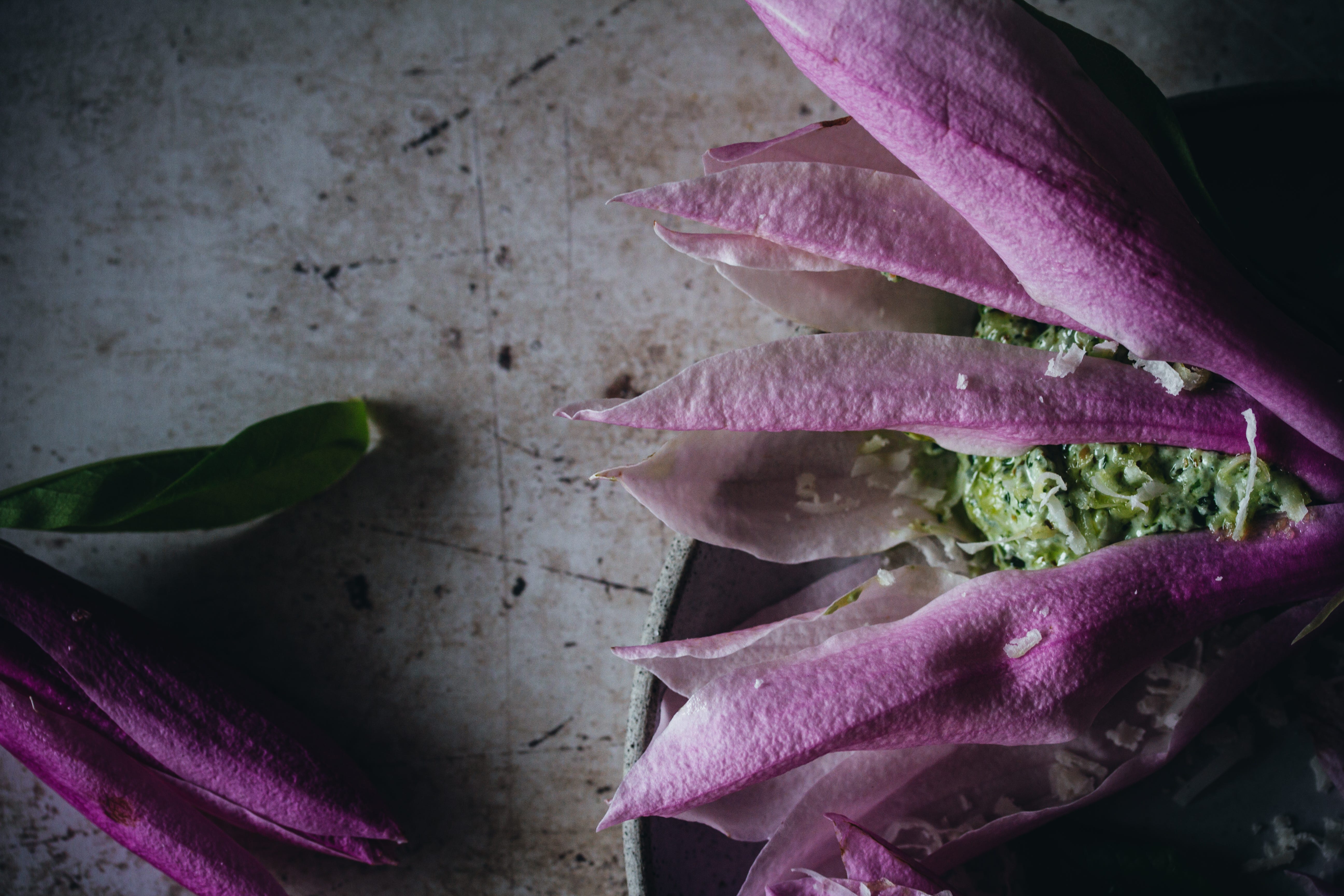 The most elegant way to use these beautiful petals is to make stuffed magnolia blossoms (in the same way you would make stuffed zucchini blossoms). They are really easy and quick to make, require just a few ingredients, and are true eye-catching finger food. What you need are young magnolia petals and a filling. I used a mix of wild garlic pesto, ricotta cheese, and Parmigiano, salt, and pepper. Simple ricotta cheese with mozzarella, lemons zest, and fresh basil makes a wonderful light and delicious filling too. You can serve them fresh or dip them in egg batter and fry them in a pan.